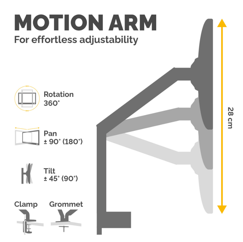 • Mounting: Desk mount using clamp or grommet fixing, desk thickness supported 1 cm to 8.5 cm