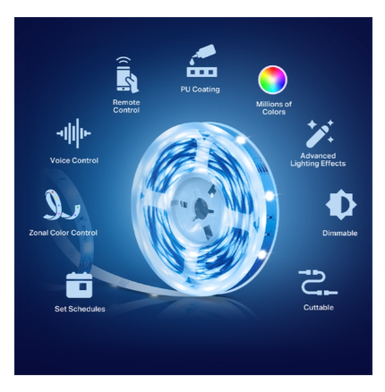 • Features: The strip can sync to music / audio frequencies. Scheduling / timers / “away mode” (simulate presence) via app. Works with Alexa / Google Assistant (via Tapo app)